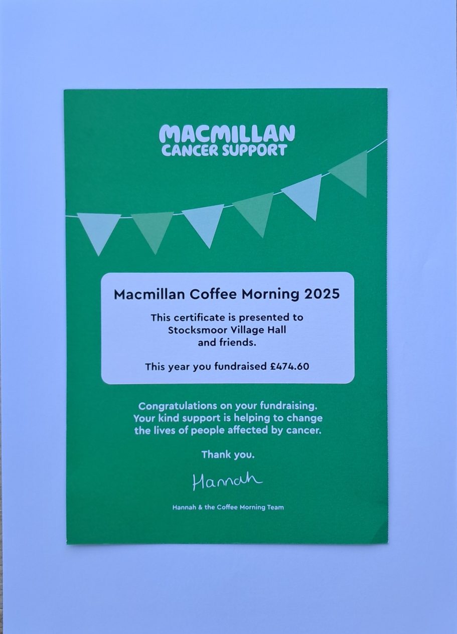 The Hall has hosted many Community events and fund raising activities over the years including the Queens Platinum Jubilee in 2022 and the Kings Coronation in 2023. More recently in September 2025 a coffee morning event raised a raised a fabulous £474.60 in aid of MacMillan Cancer Support.